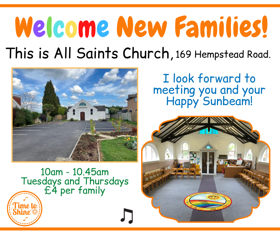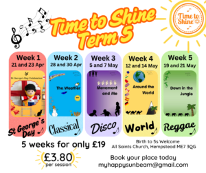 Welcome to Time to Shine - a fun baby and toddler class for under 5s held on Tuesdays and Thursdays at 10am during term time at All Saints Church (169 Hempstead Road, Hempstead ME7 3QG).